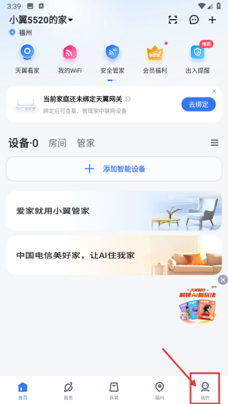 1、打開(kāi)智能家居類(lèi)APP首頁(yè),點(diǎn)擊底部我的選項(xiàng),進(jìn)入個(gè)人中心頁(yè)面。