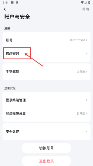 4、在賬戶(hù)與安全頁(yè)面,點(diǎn)擊修改密碼選項(xiàng),即可進(jìn)入密碼修改頁(yè)面完成密碼修改操作。