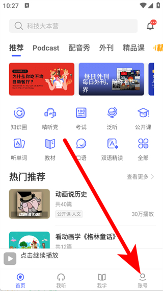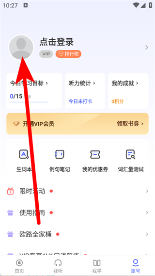 1、打開每日英語聽力,點(diǎn)擊底部賬號(hào),進(jìn)入個(gè)人頁面。