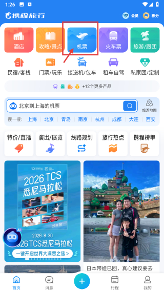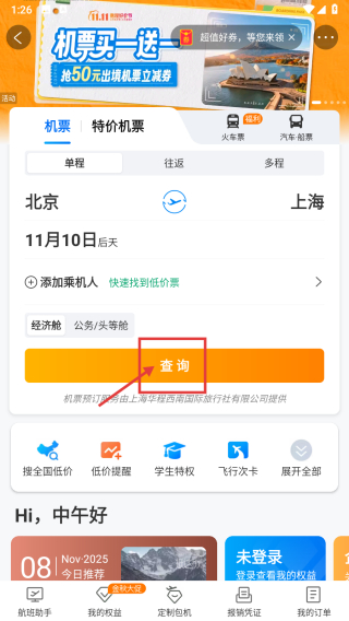 1、打開旅行類APP,點(diǎn)擊機(jī)票分類標(biāo)簽,進(jìn)入機(jī)票查詢頁面。
