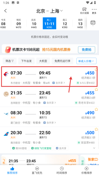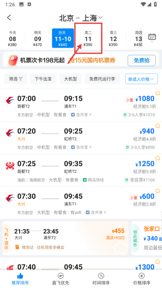 3、在航班列表頁面,選擇11月11日周二的航班日期,篩選出當(dāng)日航班。