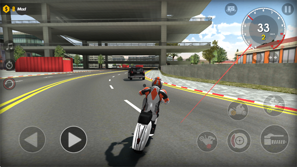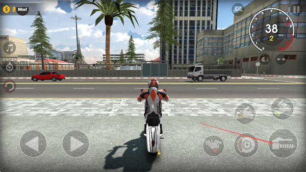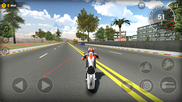 1、點擊右側(cè)加速按鈕提升摩托車速度,在城市道路上行駛,注意躲避其他車輛。