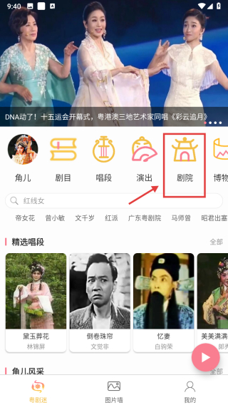 1、打開(kāi)戲曲類(lèi)APP,點(diǎn)擊劇院分類(lèi)標(biāo)簽,進(jìn)入劇院推薦頁(yè)面。