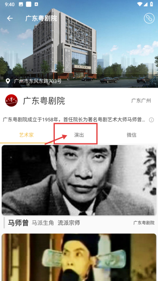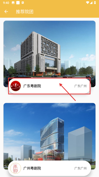 2、在劇院推薦頁(yè)面,點(diǎn)擊廣東粵劇院,進(jìn)入劇院詳情頁(yè)面。