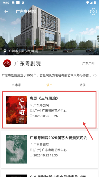 4、在演出列表中,可查看粵劇三氣周瑜的演出信息,包括演出地點(diǎn)和時(shí)間等詳情。