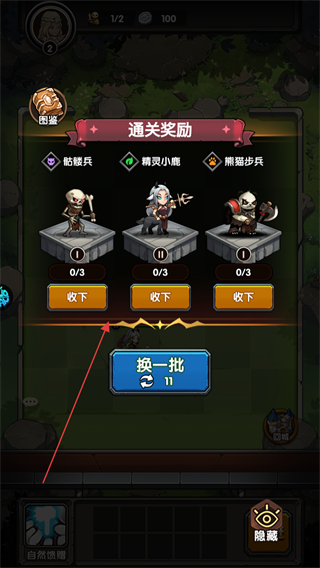 4、通關(guān)后,可選擇收下骷髏兵、精靈小娜、熊貓步兵等獎勵,增強己方戰(zhàn)力。