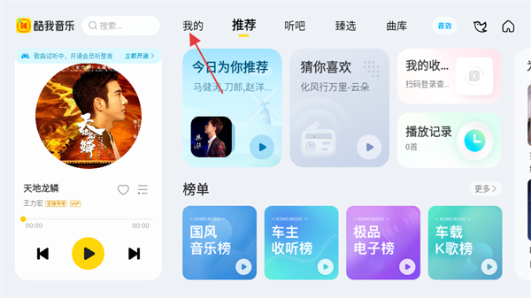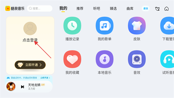 1、在酷我音樂首頁,點(diǎn)擊左上角我的選項(xiàng),進(jìn)入個人頁面。
