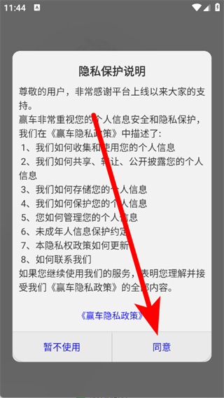 1、打開贏車網(wǎng),在隱私保護(hù)說明彈窗中點(diǎn)擊同意。