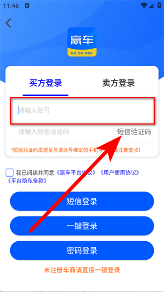 3、在登錄頁面,輸入賬號(hào)后,點(diǎn)擊短信驗(yàn)證碼。