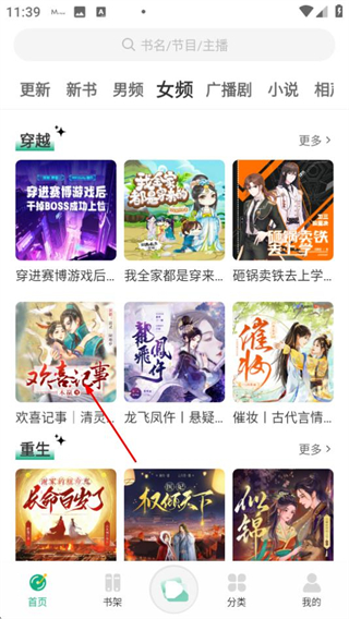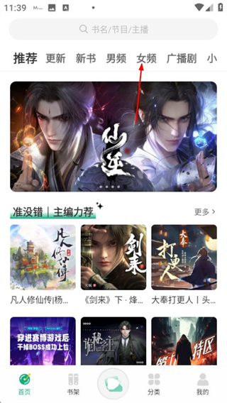 1、在小梨聽書首頁,點擊女頻選項,進入女頻小說頁面。
