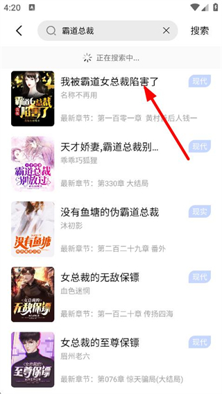4、在搜索結(jié)果中,點擊我被霸道女總裁陷害了,進入小說詳情頁。