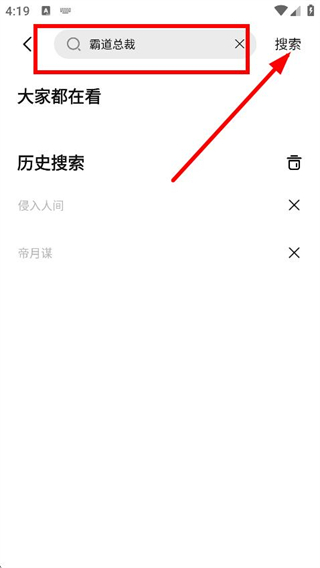 3、隨后在搜索頁面,然后輸入霸道總裁,點擊搜索。