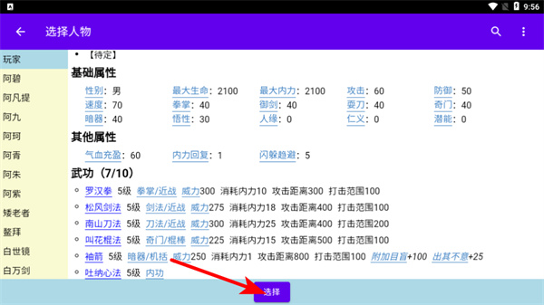2、選擇人物時(shí),點(diǎn)擊選擇按鈕可確定參戰(zhàn)角色,這是組建戰(zhàn)斗隊(duì)伍的關(guān)鍵操作,關(guān)注角色屬性和武功搭配以提升戰(zhàn)力。