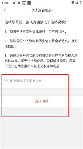 5、在申請(qǐng)注銷賬戶頁面,勾選協(xié)議后點(diǎn)擊確認(rèn)注銷,完成注銷。