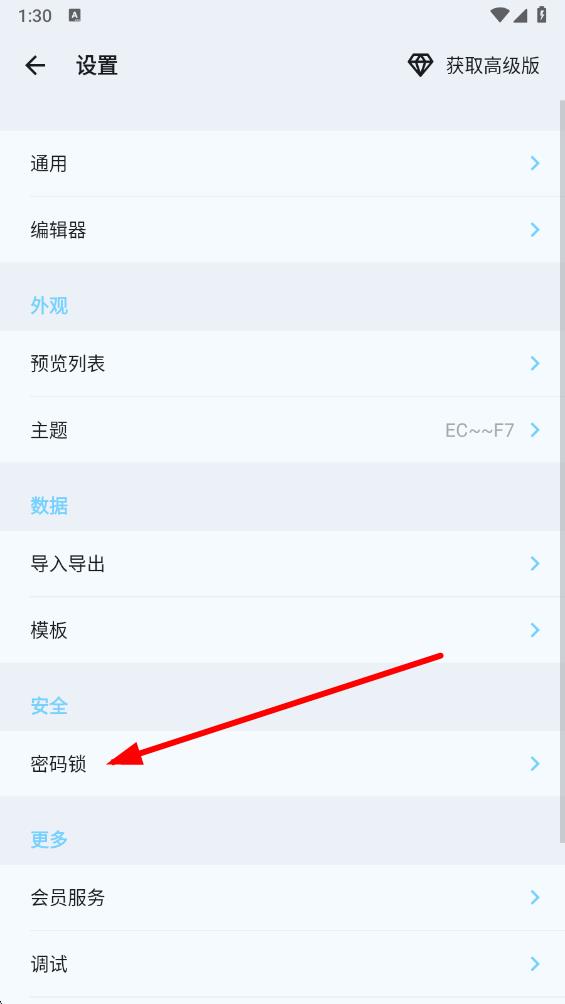 3、在設(shè)置界面里,向下滑動找到安全板塊,點擊其中的密碼鎖選項。