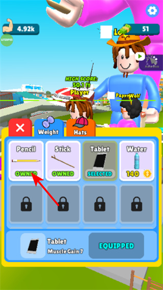 2、在物品界面選擇如Pencil之類的已擁有物品,裝備以提升角色屬性,增強(qiáng)角色能力的關(guān)鍵步驟,選擇需根據(jù)物品效果進(jìn)行搭配。