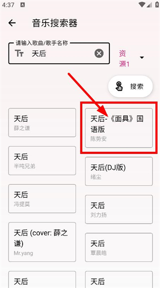 3、在搜索結(jié)果中,選擇想要的歌曲版本的天后,即可進(jìn)行后續(xù)操作。