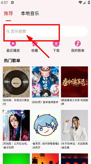 1、在APP首頁,點(diǎn)擊音樂搜索框,進(jìn)入音樂搜索器頁面。