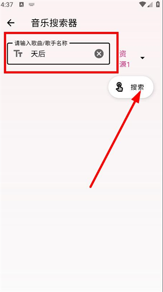 2、在音樂搜索器頁面,輸入歌曲/歌手名稱,來點(diǎn)擊搜索。