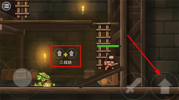 3、跳躍按鈕點擊可讓角色跳躍,遇到高處平臺或深坑時使用,還可觸發(fā)二段跳,在空中再次點擊跳躍按鈕能跳得更高更遠。