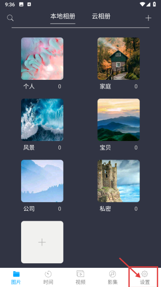 1、打開相冊類應(yīng)用,點(diǎn)擊底部設(shè)置選項(xiàng),進(jìn)入系統(tǒng)設(shè)置頁面。