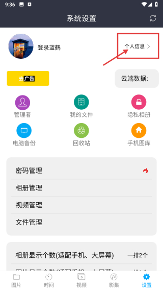 2、在系統(tǒng)設(shè)置頁面,點(diǎn)擊個(gè)人信息選項(xiàng),進(jìn)入登錄藍(lán)鶴云界面。