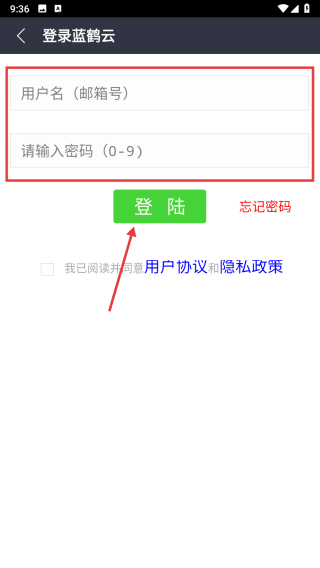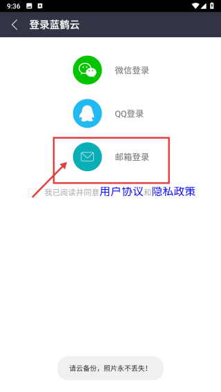 3、在登錄藍(lán)鶴云頁面,選擇郵箱登錄方式,進(jìn)入賬號密碼填寫界面。