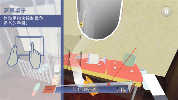 1、劃動手指控制章魚奶爸手臂,清理桌上雜物,完成清理桌子任務。