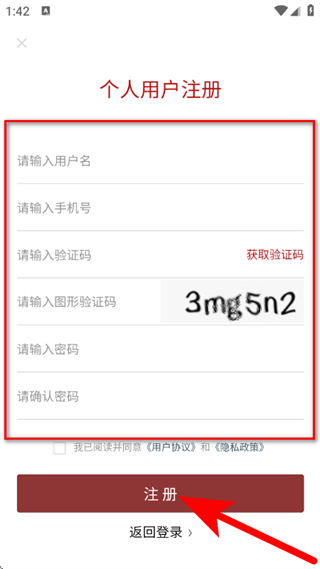 4、輸入用戶名,輸入驗證碼,設置密碼并確認密碼,勾選后,點擊注冊。