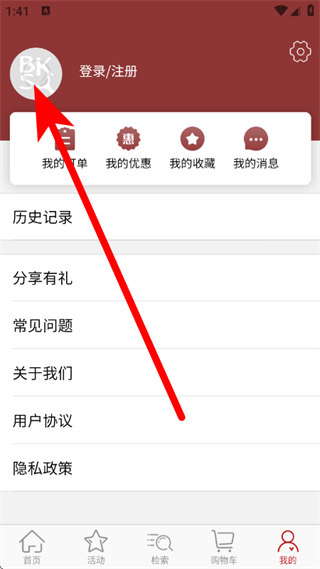 2、在我的頁面,點擊登錄注冊區(qū)域,進入登錄頁面。