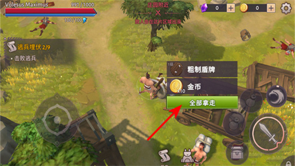 2、開啟資源點(diǎn)后,點(diǎn)擊全部拿走按鈕,可獲取道具和金幣,這是積累資源的關(guān)鍵步驟,獲取時(shí)需及時(shí)操作避免遺漏。