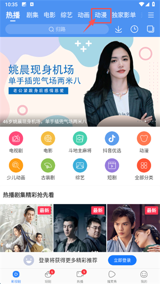 1、打開視頻類應(yīng)用,點擊頂部動漫分類標(biāo)簽,進入動漫專屬頁面。