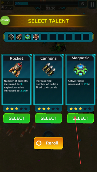 4、升級時選擇天賦,如Magnetic擴大作用范圍,增強坦克戰(zhàn)力,助力通關。