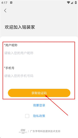 4、在注冊(cè)界面,輸入用戶昵稱、手機(jī)號(hào)后點(diǎn)擊獲取驗(yàn)證碼。