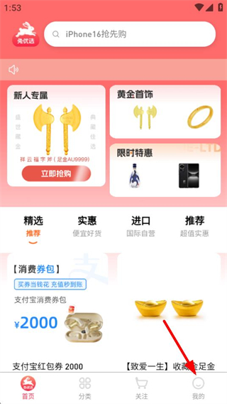 1、在兔優(yōu)選首頁(yè),點(diǎn)擊右下角我的選項(xiàng),進(jìn)入個(gè)人頁(yè)面。