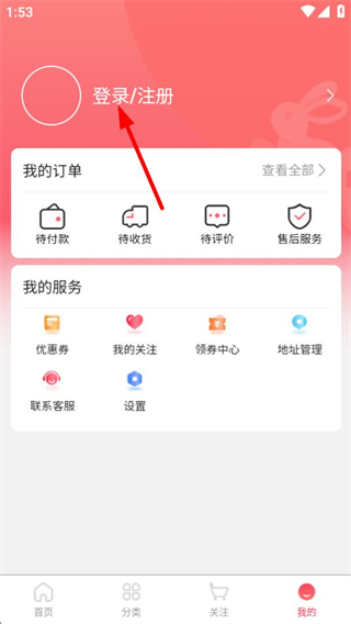 2、在個(gè)人頁(yè)面,點(diǎn)擊登錄注冊(cè)區(qū)域,進(jìn)入登錄頁(yè)面。