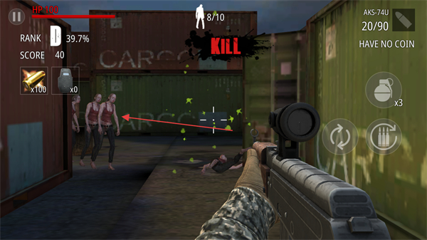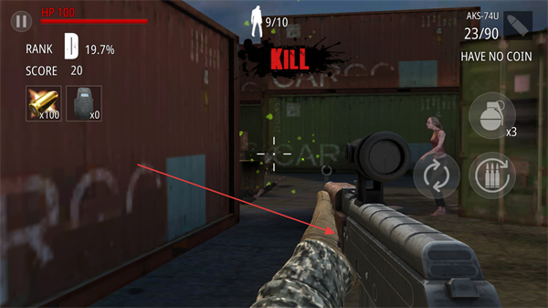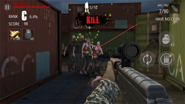 1、使用槍械瞄準(zhǔn)僵尸射擊,消滅僵尸積累擊殺數(shù)和分?jǐn)?shù)。