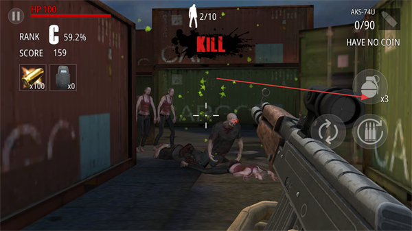 4、在彈藥不足或僵尸密集時(shí),使用手雷技能,對(duì)僵尸群造成范圍傷害。