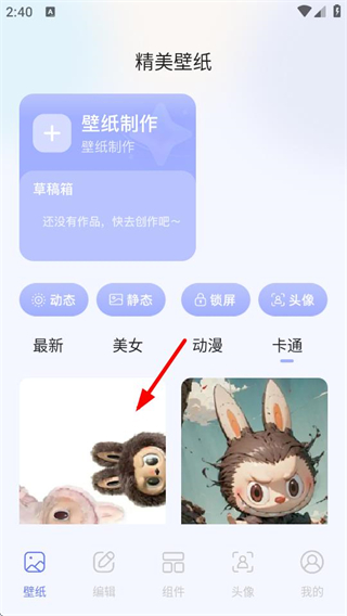 1、在壁紙頁面,點(diǎn)擊分類中的卡通選項(xiàng),切換至卡通類壁紙列表。