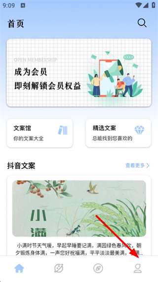 1、在文案館首頁,點擊底部導(dǎo)航欄的我的選項,可進(jìn)入個人相關(guān)頁面。