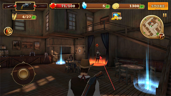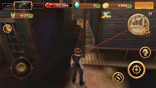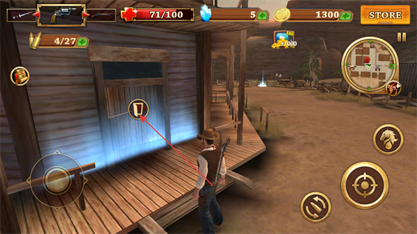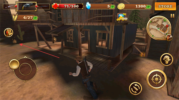 1、操控牛仔在西部小鎮(zhèn)移動,左側(cè)搖桿控制方向,探索場景尋找任務(wù)區(qū)域。