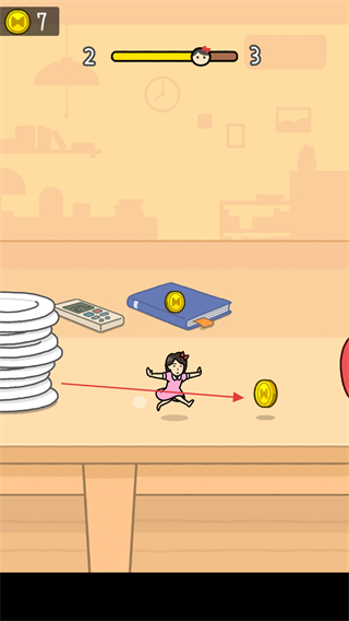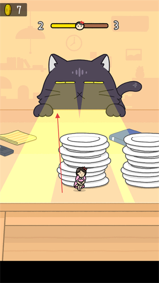 1、操控小人躲避黑貓,收集桌上金幣,同時觀察上方進度條,避免被黑貓發(fā)現(xiàn)。