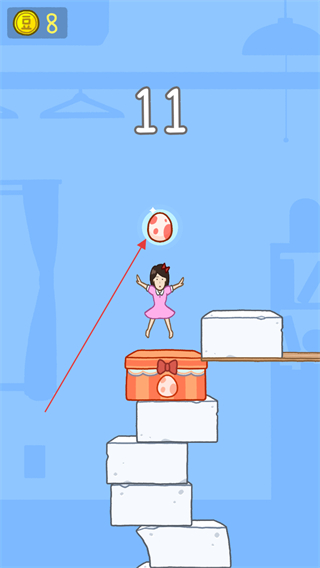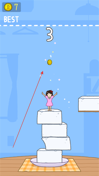 1、操控女孩跳躍豆腐,上方數(shù)字顯示3,收集空中金幣,積累層數(shù)同時(shí)獲取資源。