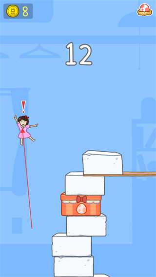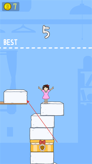 2、持續(xù)跳躍,層數(shù)升至5,觸發(fā)帶裝飾的豆腐,維持平衡提升堆疊高度。