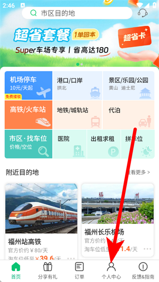1、打開淘車位停車,點(diǎn)擊底部個人中心,進(jìn)入個人中心頁面。