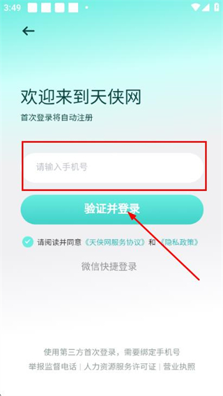 3、在登錄頁(yè)面填寫(xiě)手機(jī)號(hào),確認(rèn)勾選相關(guān)協(xié)議后點(diǎn)擊驗(yàn)證并登錄,觸發(fā)驗(yàn)證碼發(fā)送。