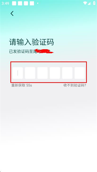 4、在請(qǐng)輸入驗(yàn)證碼頁(yè)面的輸入框中填寫(xiě)收到的驗(yàn)證碼,完成賬號(hào)的登錄操作。