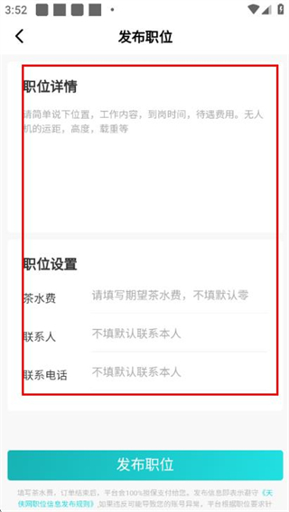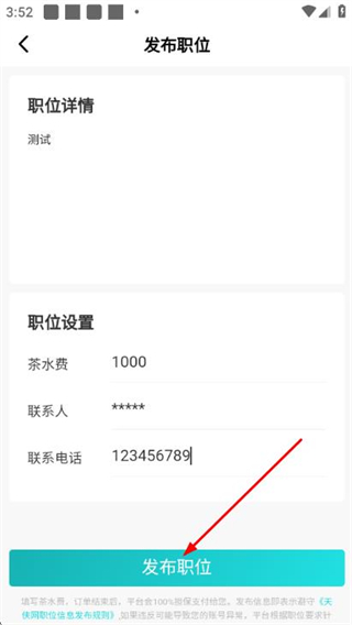 2、在發(fā)布職位頁面,填寫職位詳情,以及職位設(shè)置里的茶水費、聯(lián)系人、聯(lián)系電話等信息。