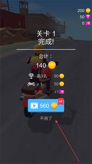 4、關(guān)卡完成后,領(lǐng)取對(duì)應(yīng)獎(jiǎng)勵(lì)金幣、禮券等,點(diǎn)擊不用了關(guān)閉額外獎(jiǎng)勵(lì)彈窗。