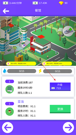 2、根據(jù)任務(wù)需求在島嶼上找到餐館,點(diǎn)擊下方的升級(jí)按鈕花費(fèi)鈔票進(jìn)行升級(jí)。